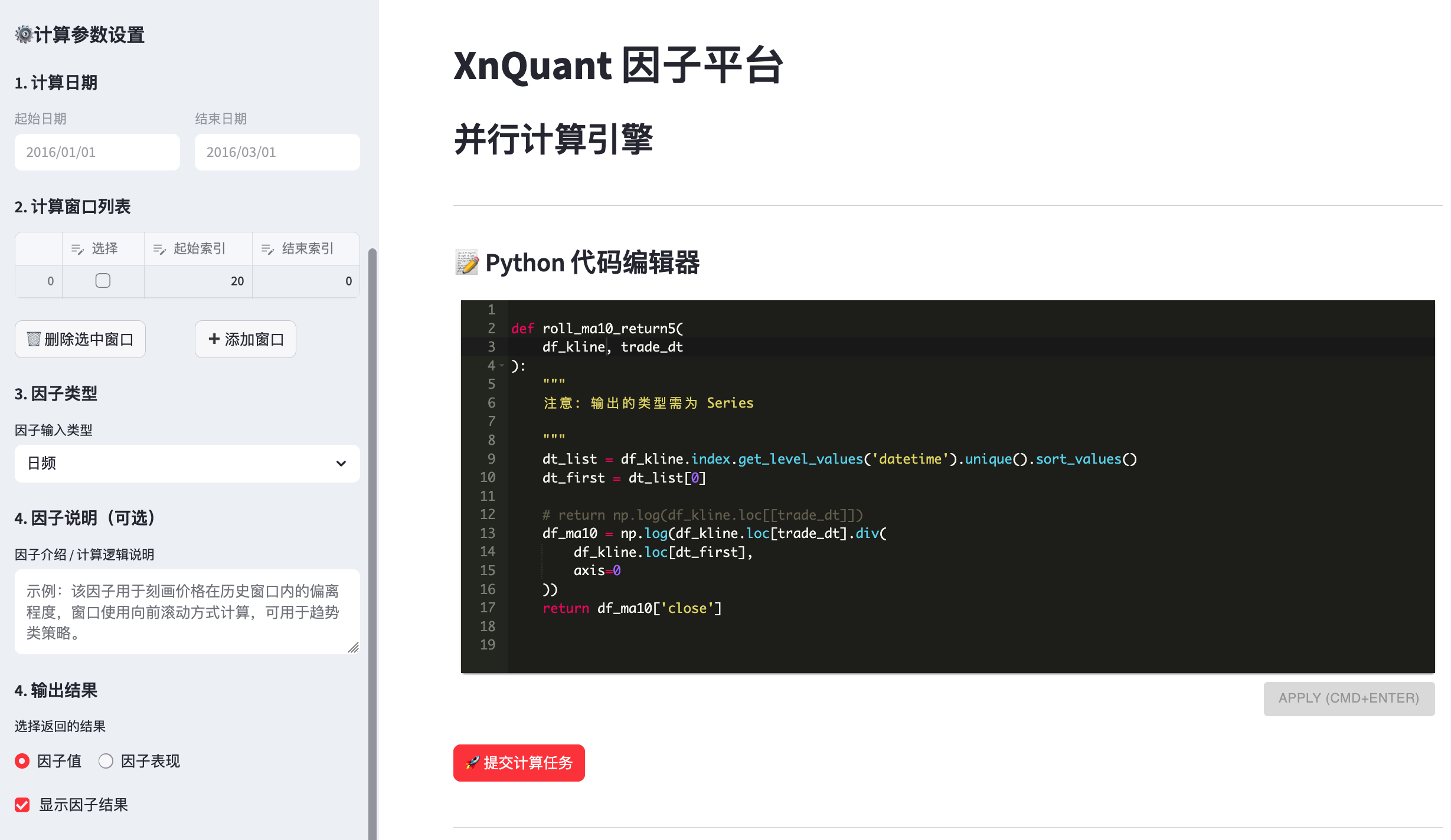 平台将在该时间区间内,对每个交易日依次触发因子计算任务。